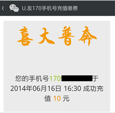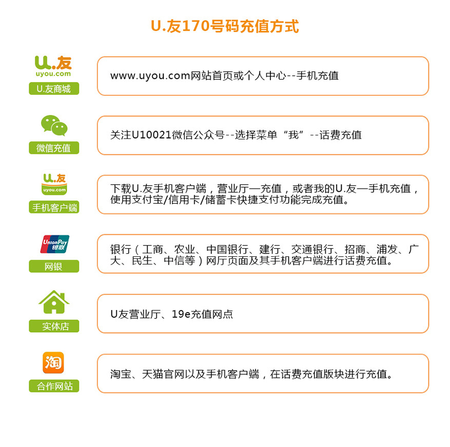 用户可以通过微信服务号——U.友 的充值缴费功能对U.友170号码进行充值。