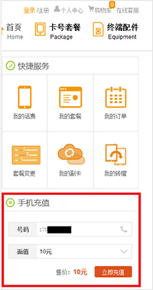 1、在主页右侧找到:手机充值功能,输入您需要充值的U.友170手机号码,点击"立即充值"按钮。