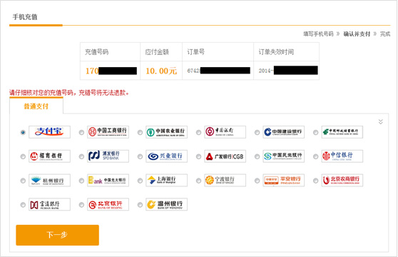 3、页面跳转至支付界面,请您选择充值支付方式,包含支付宝、银联,确认后点击"下一步"按钮。