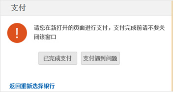 4、点击"下一步"按钮后弹出提示框,请您在新打开的页面进行支付。