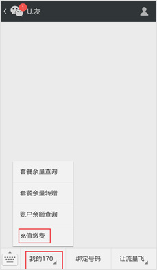 1、关注微信服务号——U.友,在与U.友聊天界面左下角点击"我的170"按钮,并在弹出的菜单中点击"充值缴费"按钮。