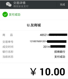 4、支付成功后会跳转至交易详情页面,并提示支付成功,点击"完成"按钮返回与U.友聊天界面。